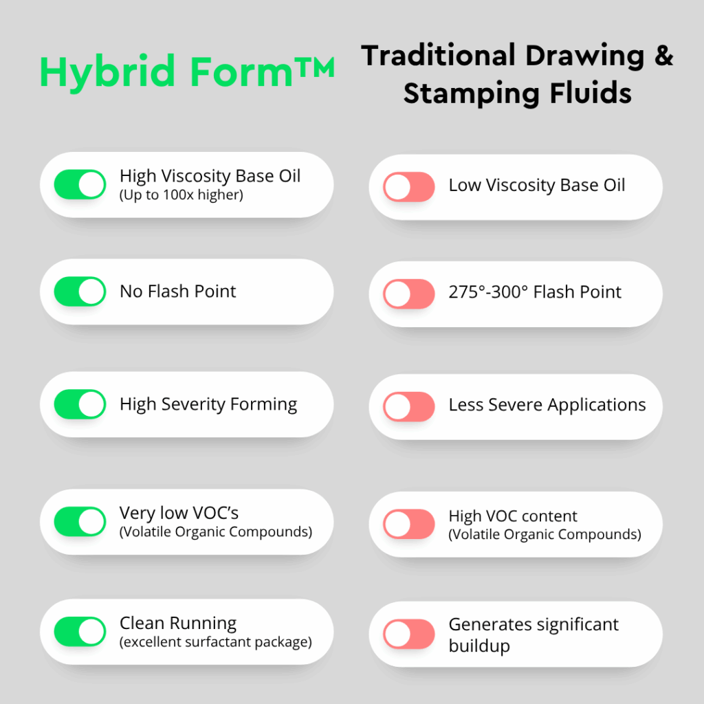 HybridFORM™ is a concentrated semi-synthetic forming fluid formulated using a proprietary preformed emulsion technology with outstanding boundary lubrication for ferrous and non-ferrous metals. It can be utilized for all light, medium or severe forming applications such as deep drawing, forming, roll forming, stamping, tube drawing, and bending of cold rolled steel, carbon steel, aluminum, copper and brass alloys. HybridFORM™ offers a balanced lubrication package containing both boundary and extreme pressure additives for enhanced forming performance, and contains the most advanced chlorine and ester extreme pressure additive technologies, making it an extremely clean running fluid with exceptional hard water stability.